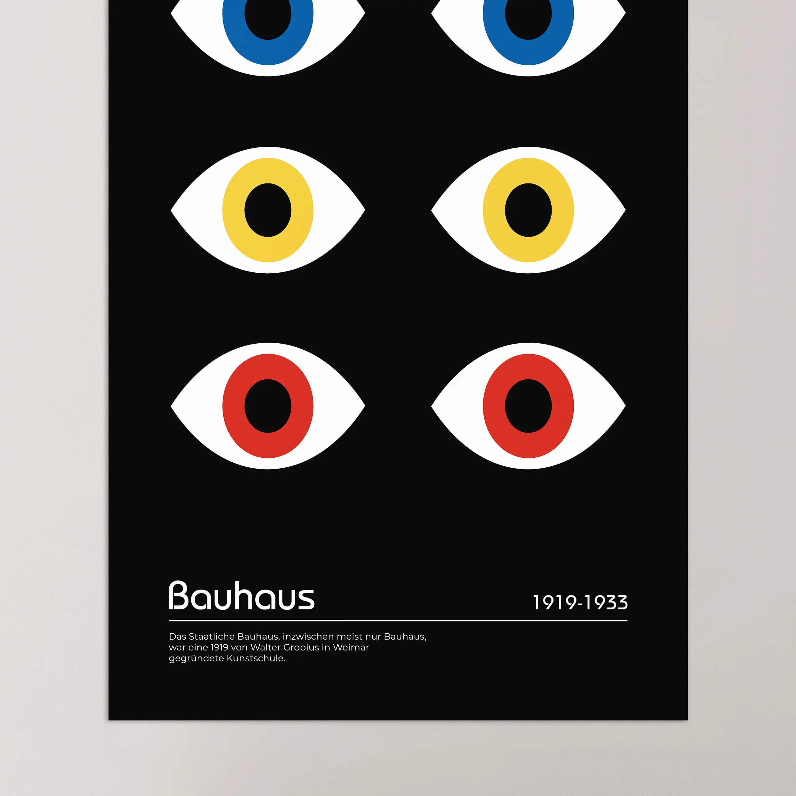 Cette affiche aux couleurs primaires originales Bauhaus rouge jaune et bleu représente trois paires de yeux superposées sur fond noir.