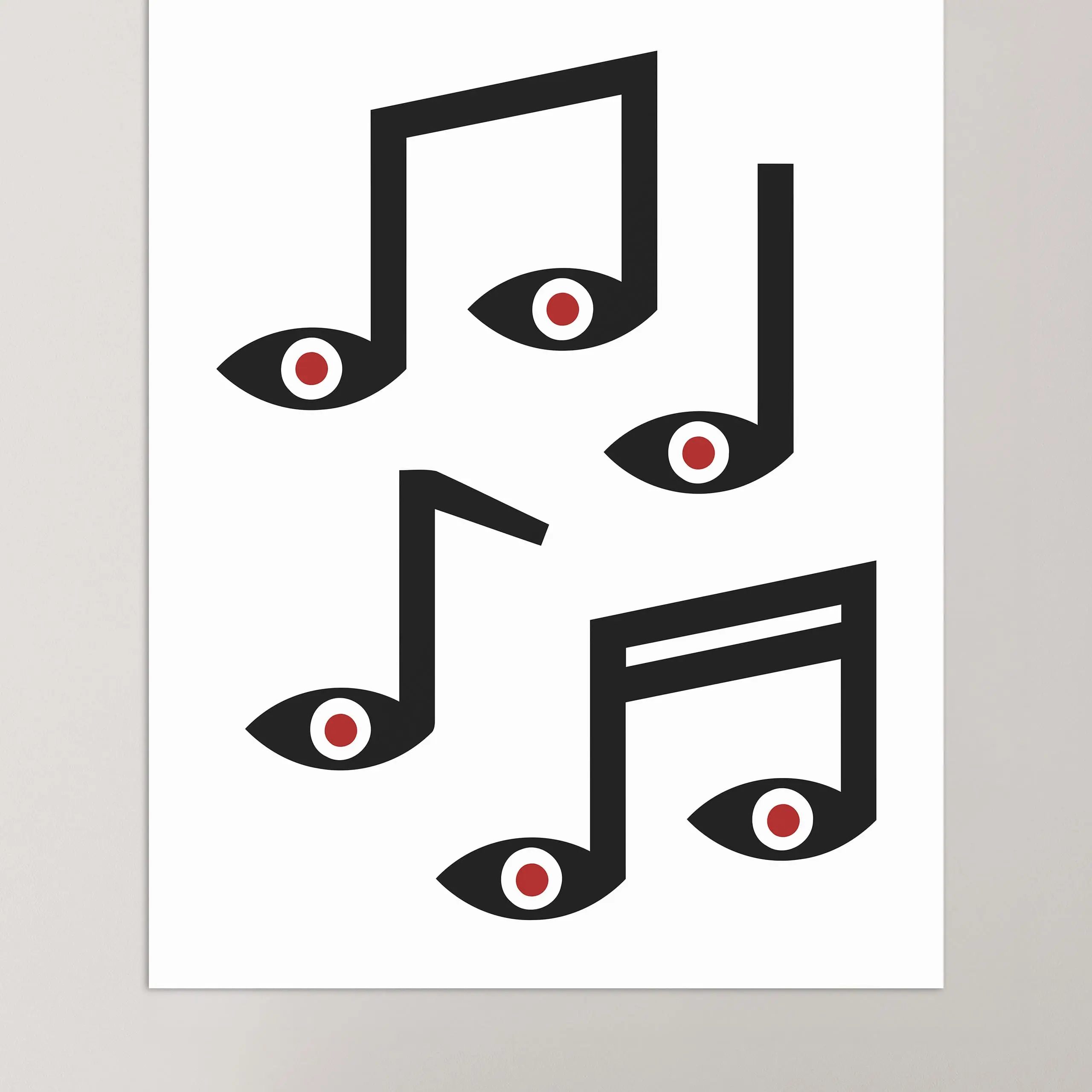 Cette affiche graphique Bauhaus rouge et noire représente des notes de musique composées avec des yeux en guise de base sur fond blanc.