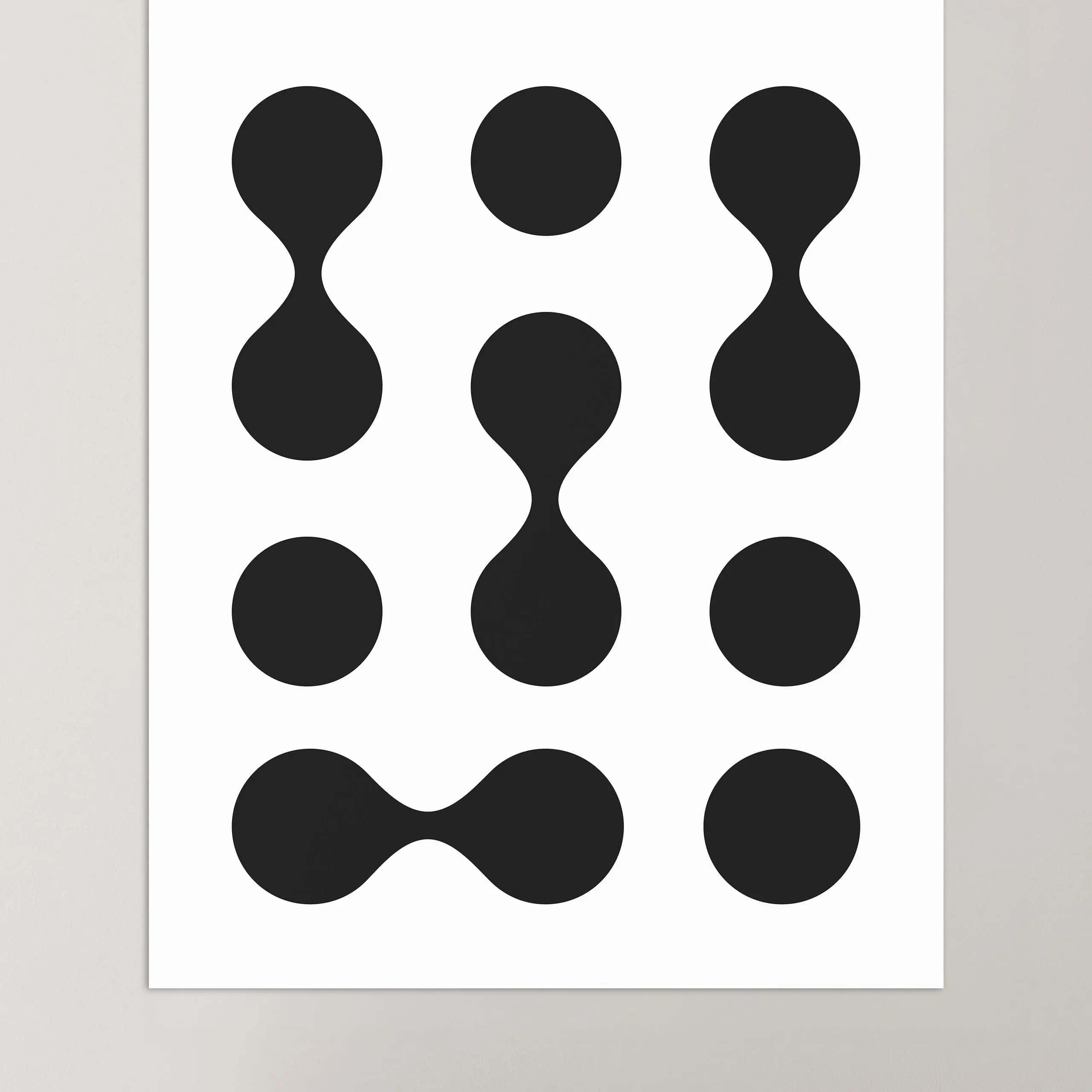 Cette affiche de couleur noire Bauhaus représente une répétition de motifs ronds alternativement reliés entre eux en forme de gouttes sur fond blanc.