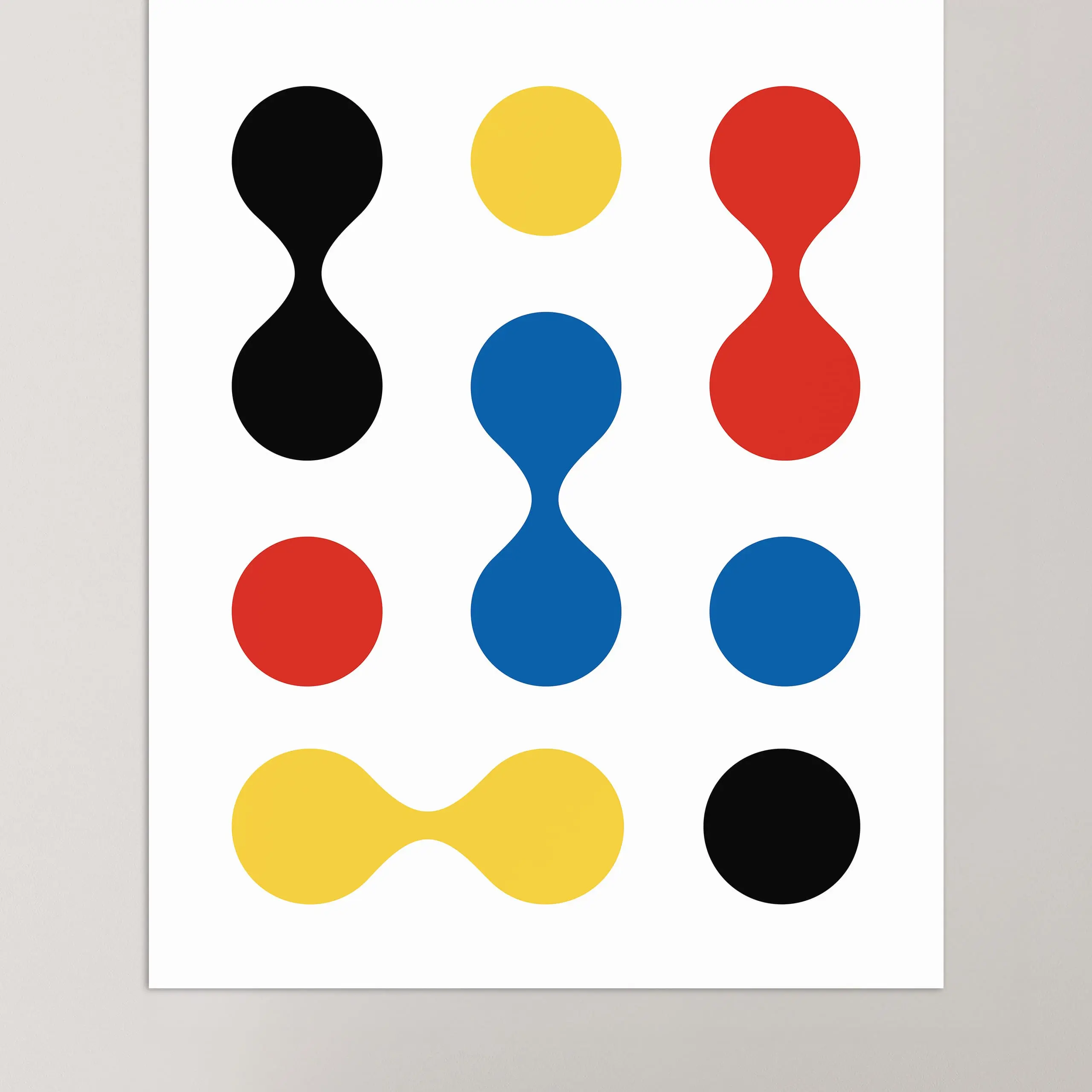 Cette affiche aux couleurs primaires originales Bauhaus rouge jaune et bleu représente une répétition de motifs ronds alternativement reliés entre eux en forme de gouttes sur fond blanc.
