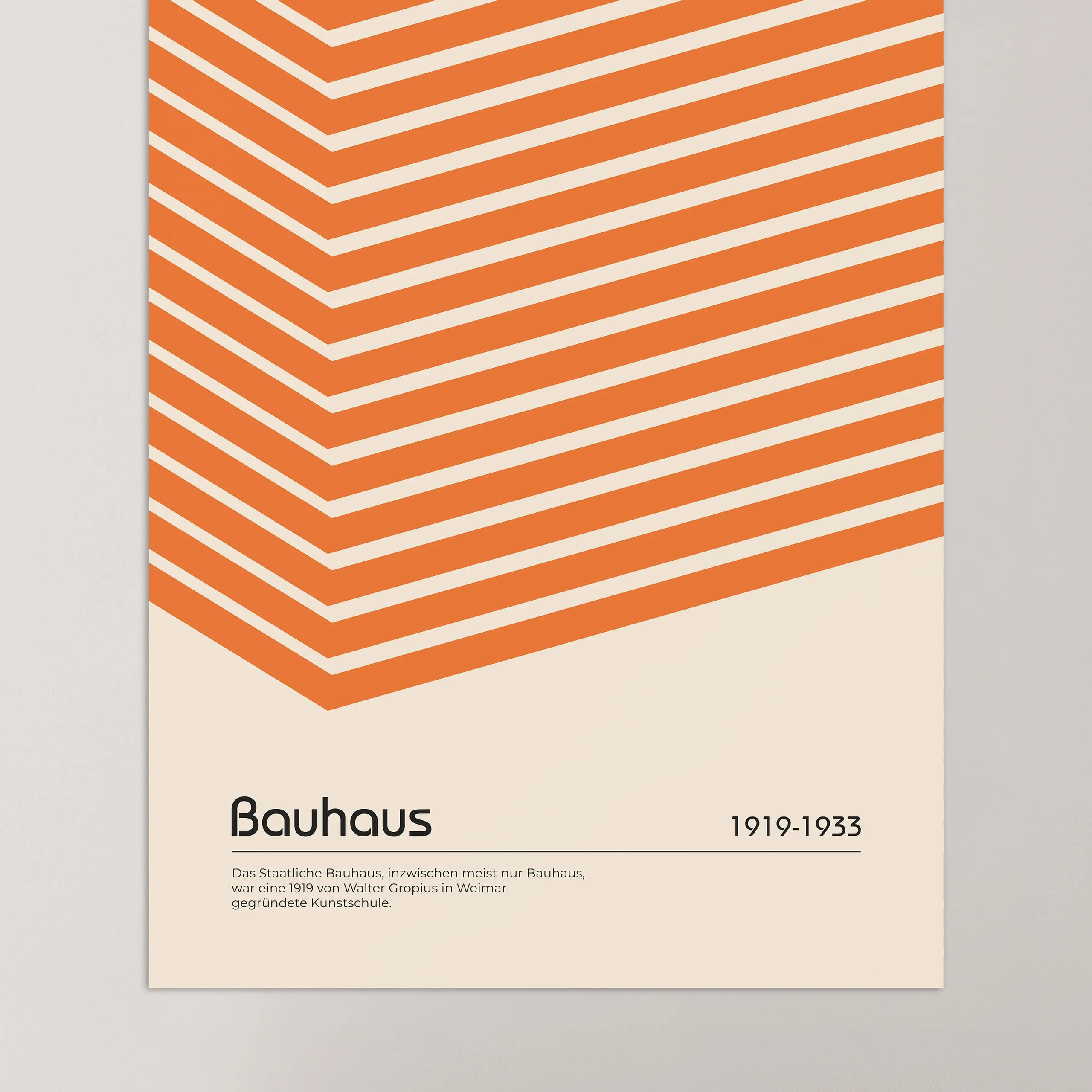 Cette affiche de couleur orange Bauhaus est constituée de lignes parallèles coudées sur fond beige.
