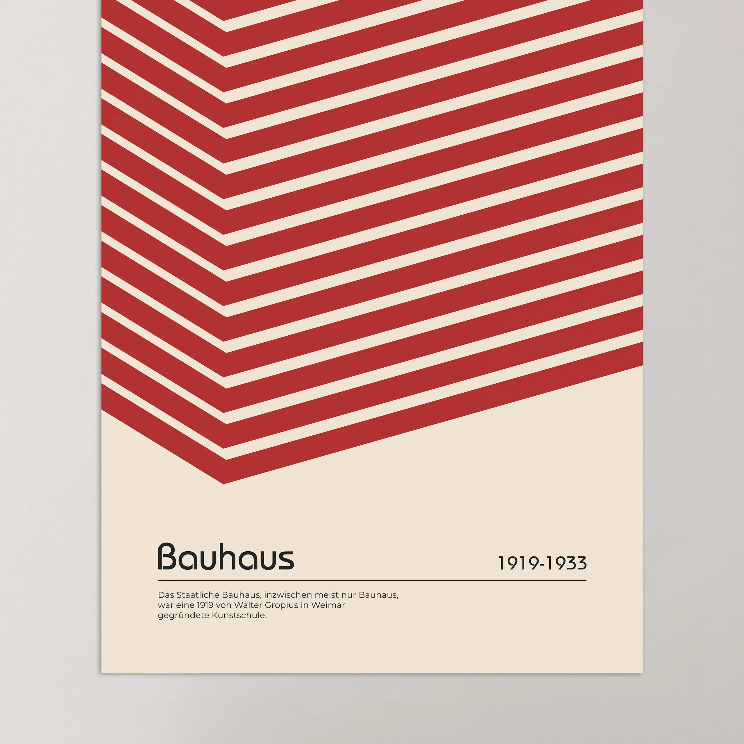 Cette affiche de couleur rouge Bauhaus est constituée de lignes parallèles coudées sur fond beige.