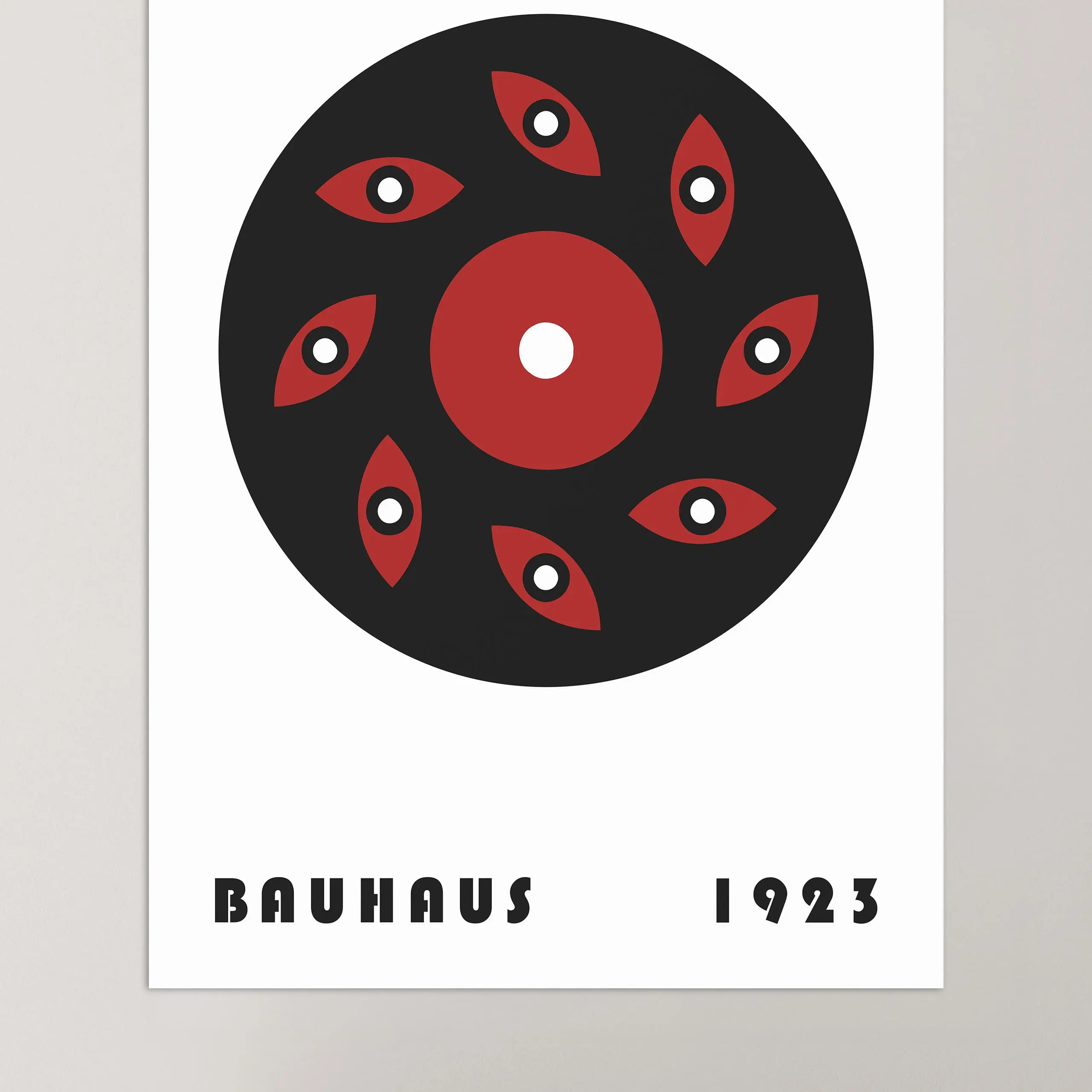 Cette affiche graphique Bauhaus rouge et noire représente un disque de coupe orné d'yeux sur fond blanc.