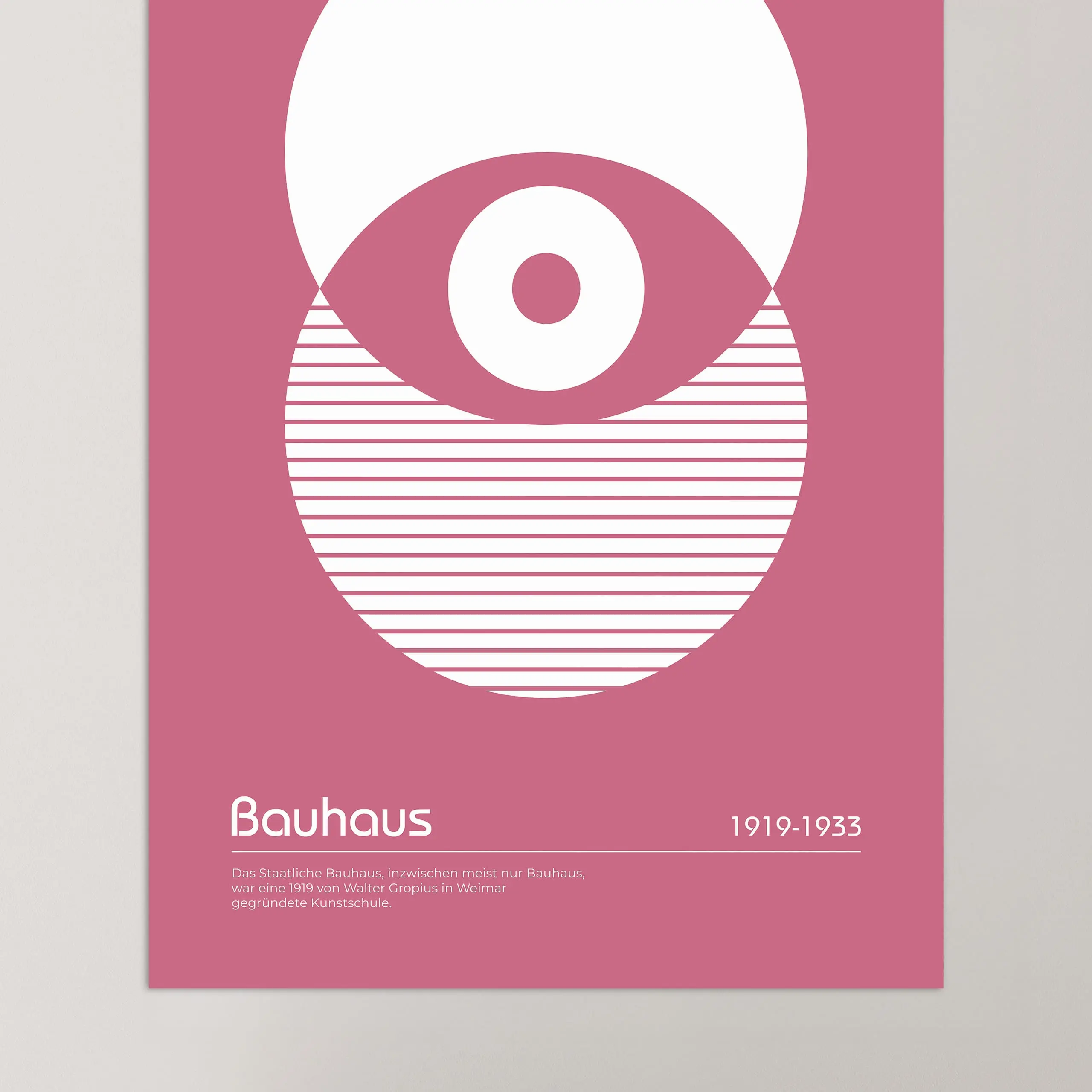 Cette affiche de couleur rose Bauhaus représente un oeil formé par la rencontre de deux cercles parfaits sur fond entièrement coloré.