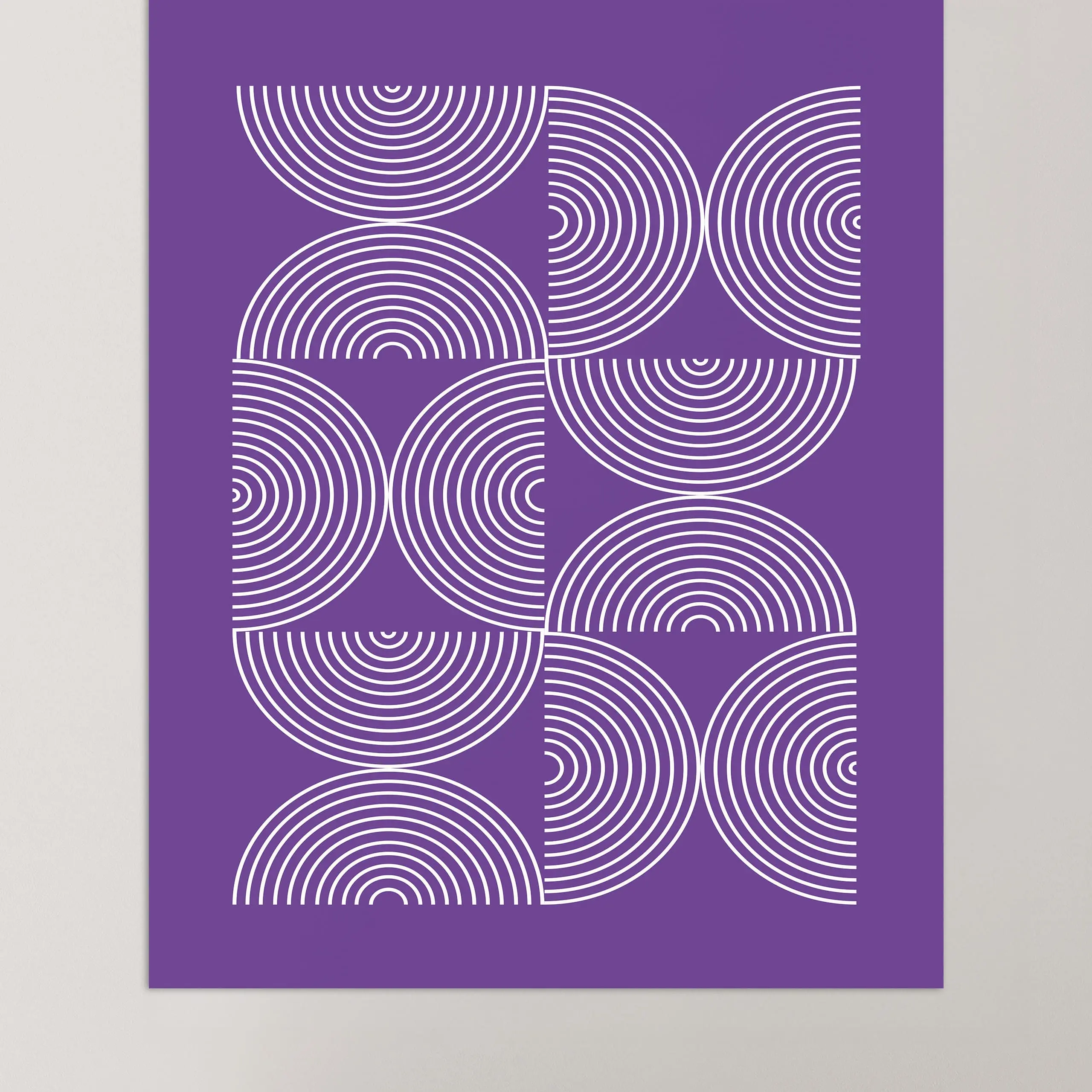 Cette affiche moderne Bauhaus est composée d'un motif répétitif en forme de lignes en demi-cercle disposées alternativement en sens inverse sur fond coloré violet.