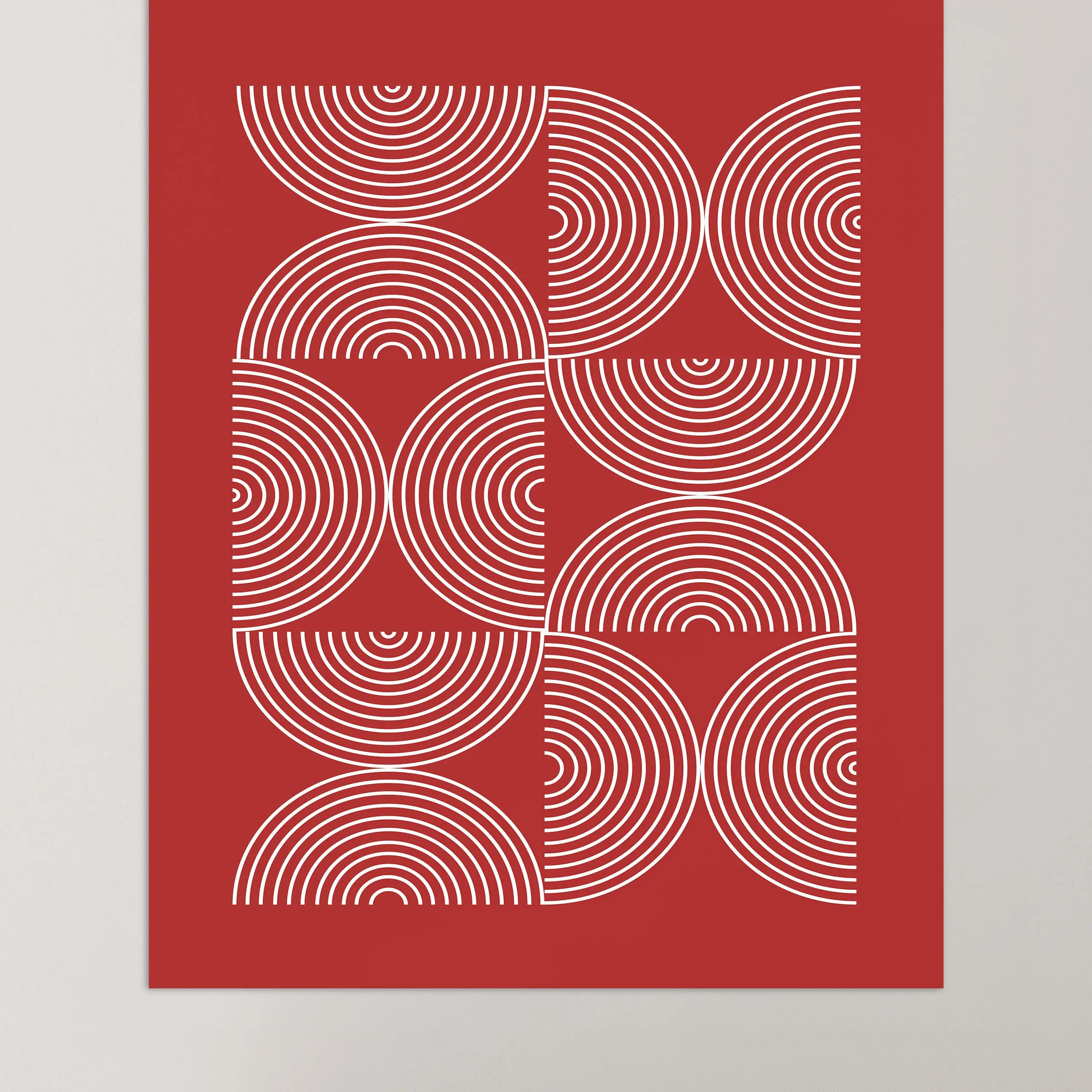 Cette affiche moderne Bauhaus est composée d'un motif répétitif en forme de lignes en demi-cercle disposées alternativement en sens inverse sur fond coloré rouge.
