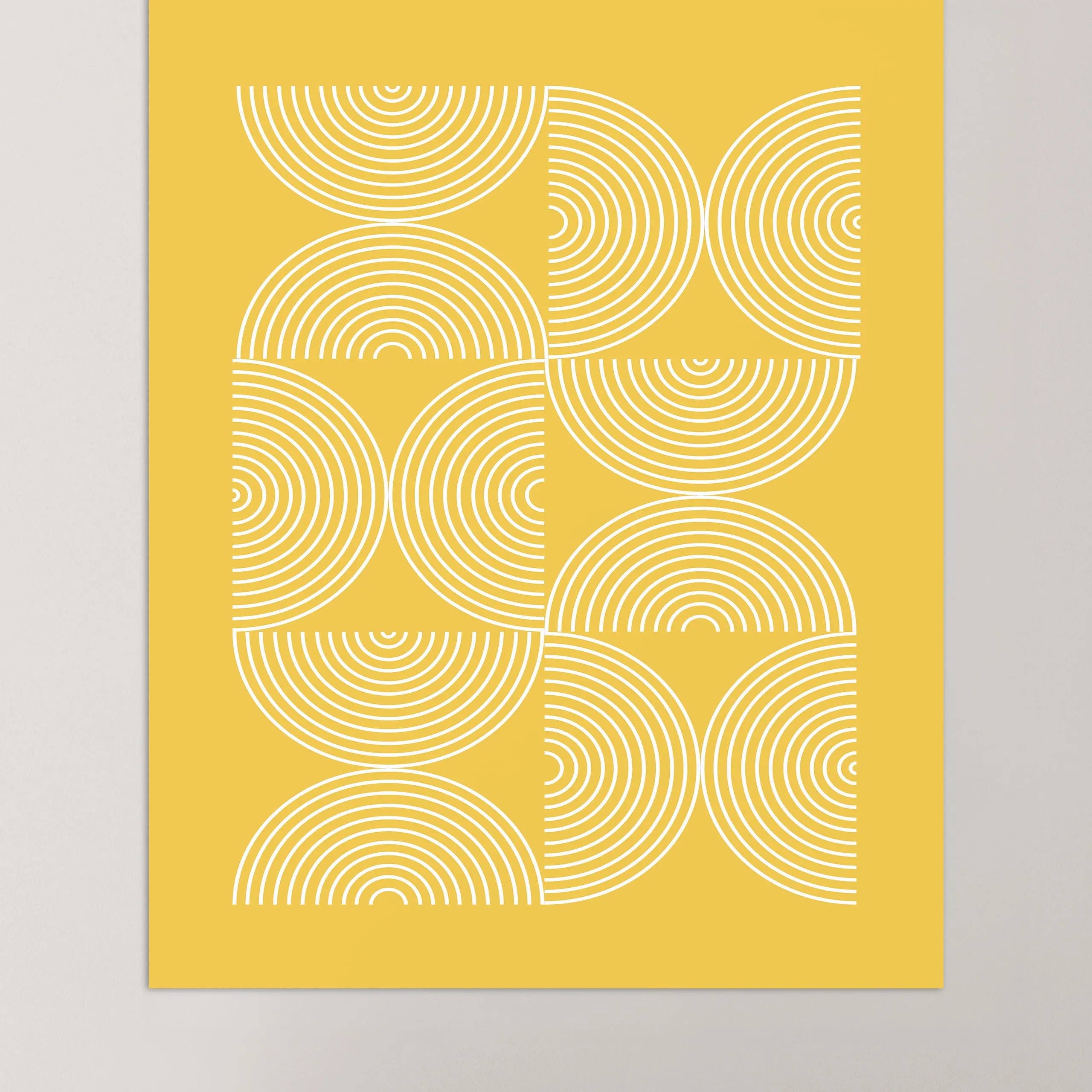 Cette affiche moderne Bauhaus est composée d'un motif répétitif en forme de lignes en demi-cercle disposées alternativement en sens inverse sur fond coloré jaune.