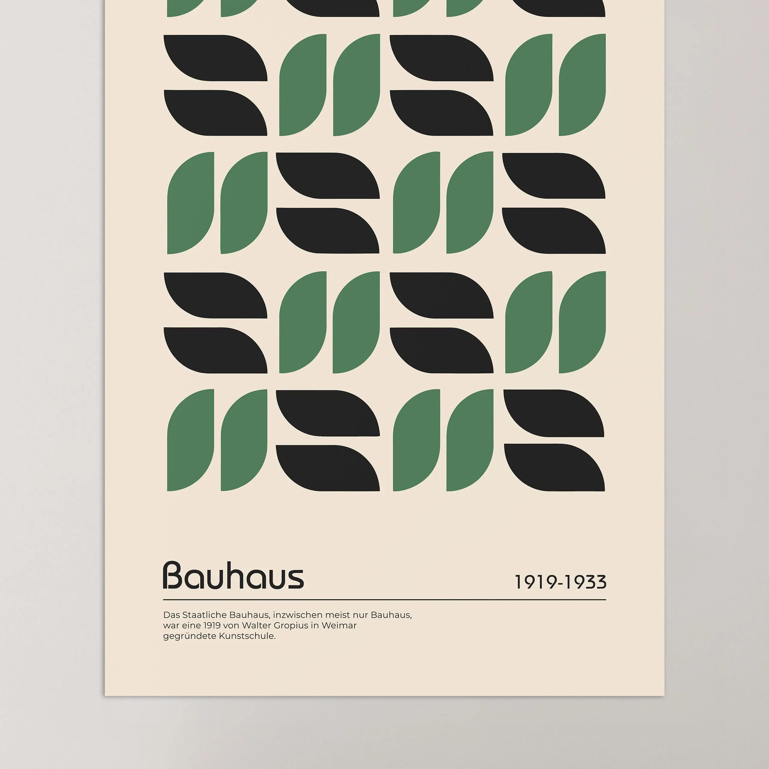 Cette affiche de couleur verte Bauhaus est composée d'un motif de tôle larmée répété en sens contraire sur fond beige.