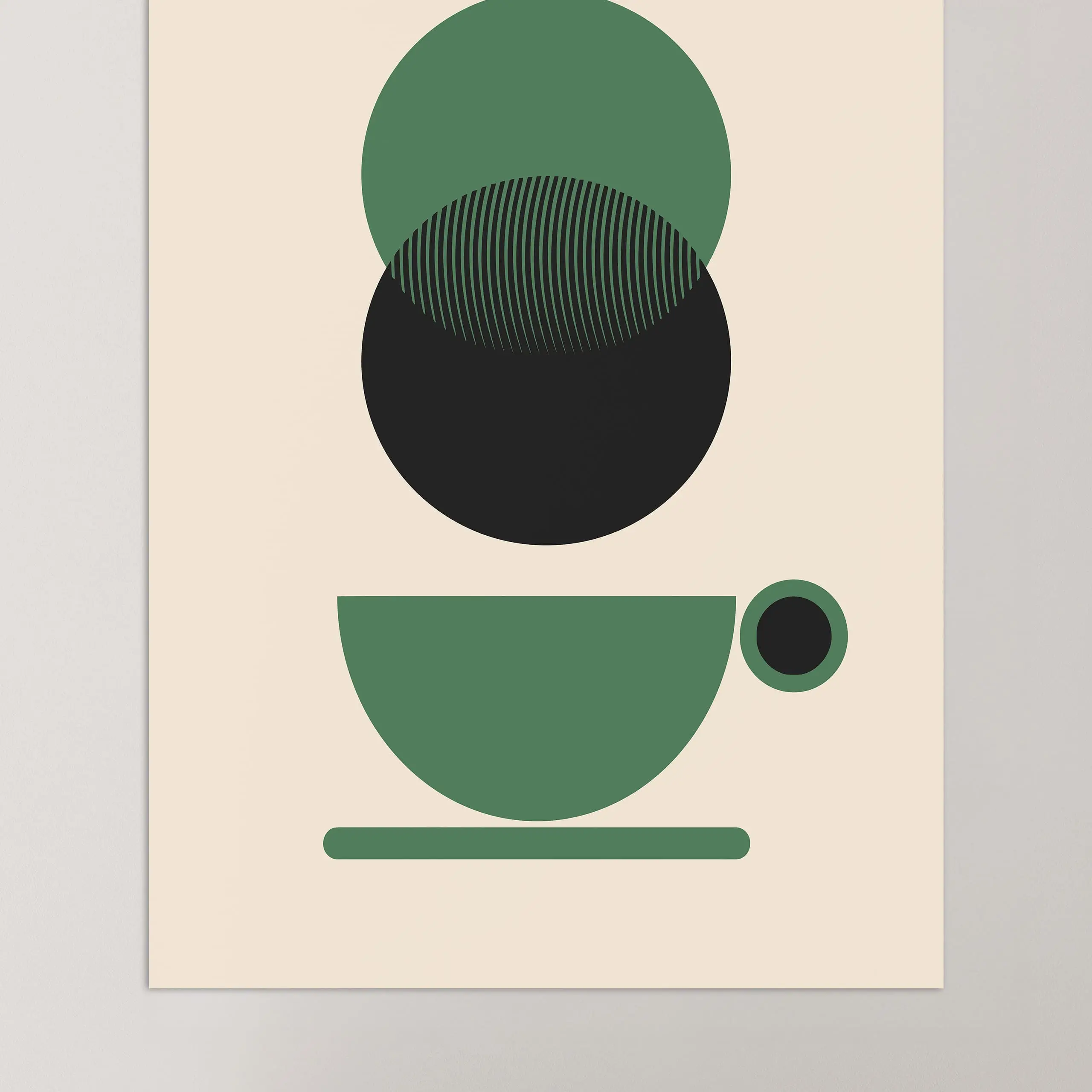 Cette affiche graphique vintage de couleur verte Bauhaus est composée d'une tasse de café et de cercles superposés sur fond beige.