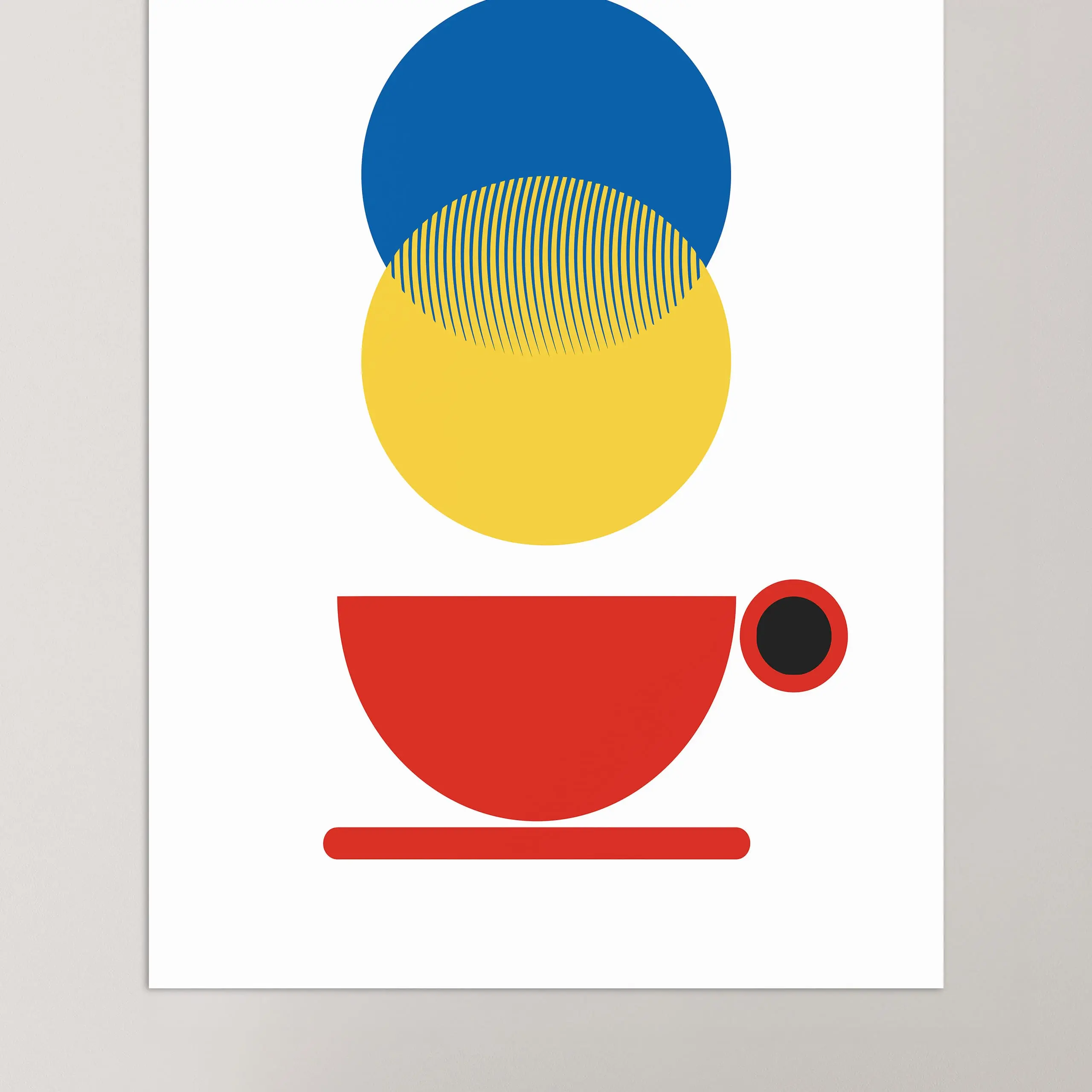 Cette affiche graphique vintage aux couleurs primaires originales Bauhaus rouge jaune et bleu est composée d'une tasse de café et de cercles superposés sur fond blanc.