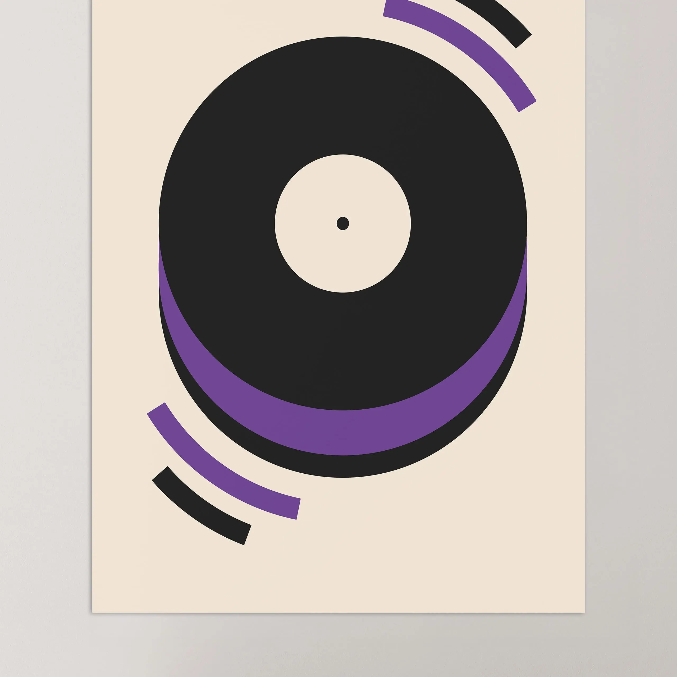 Cette affiche graphique vintage de couleur violette Bauhaus représente un disque vinyle en lecture sur fond beige.