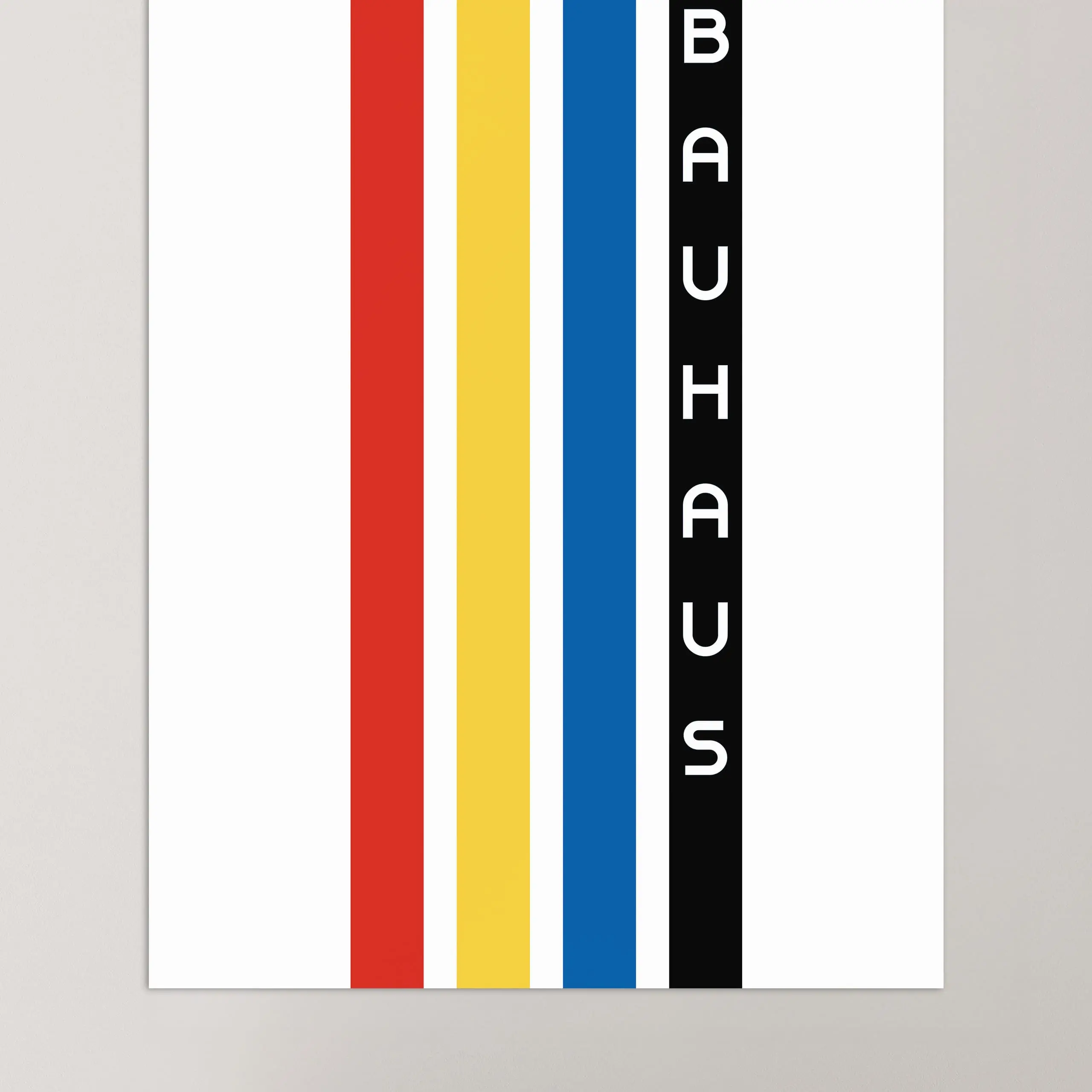 Cette affiche minimaliste aux couleurs primaires originales Bauhaus rouge jaune et bleu est composée de lignes verticales sur fond beige.