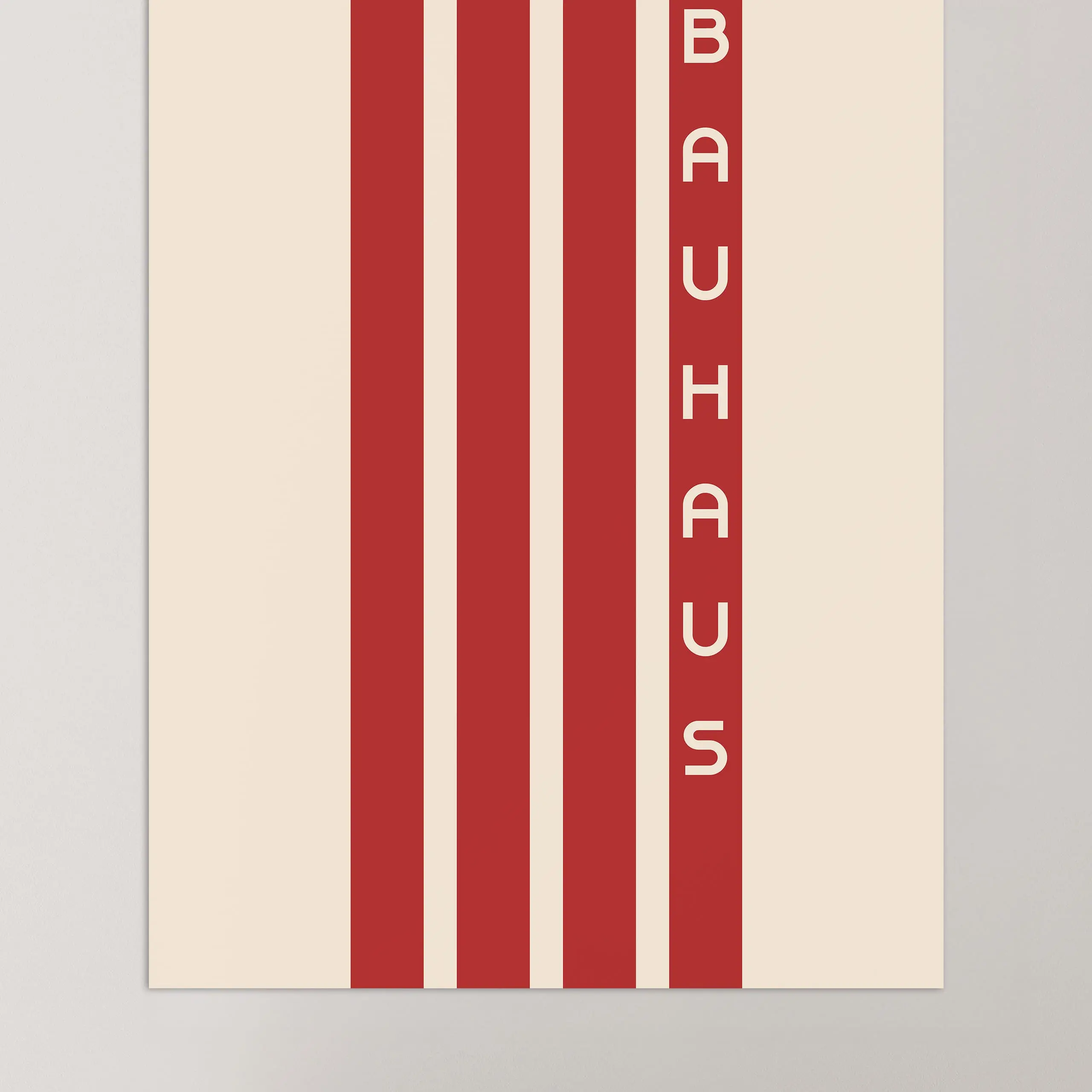 Cette affiche minimaliste de couleur rouge Bauhaus est composée de lignes verticales sur fond beige.