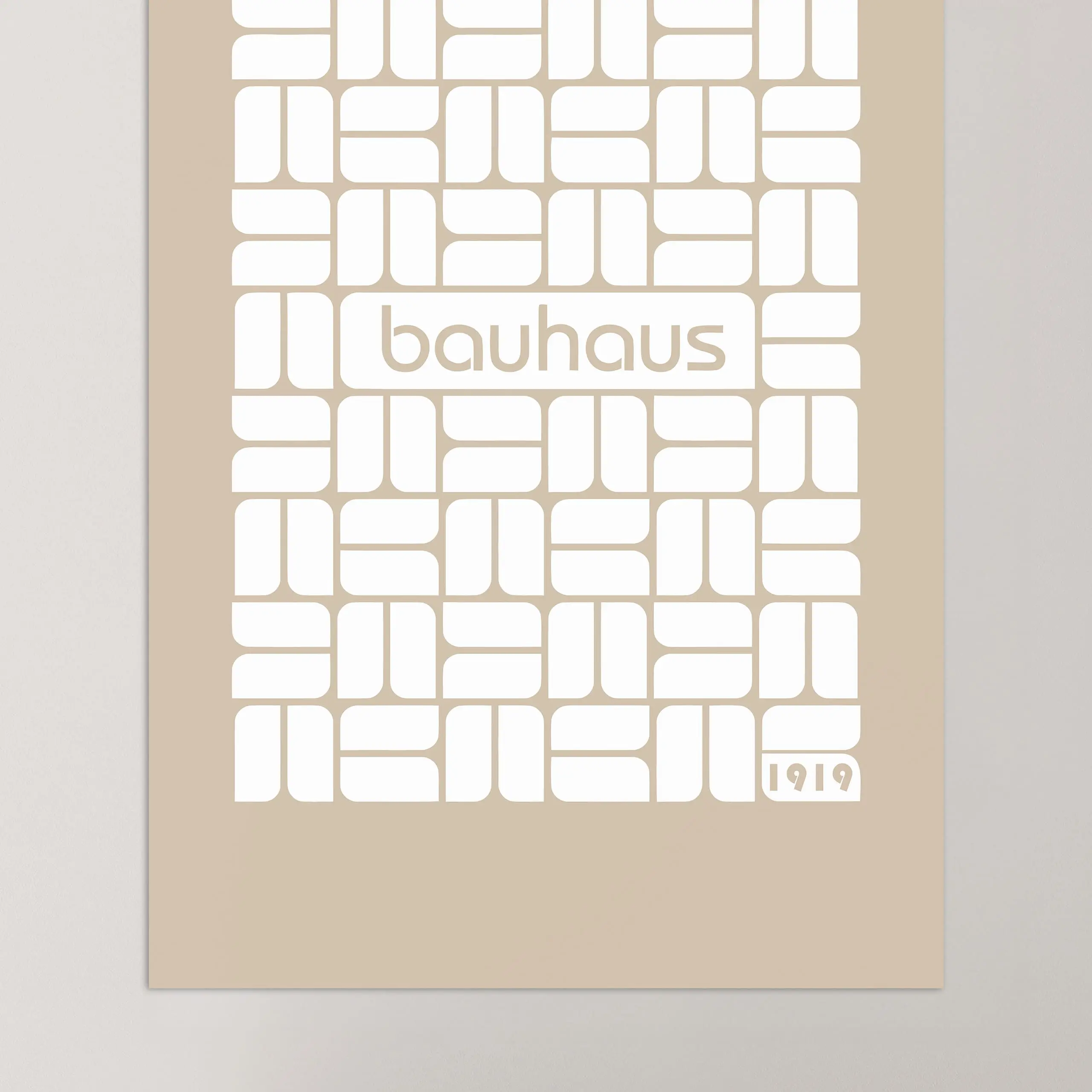 Cette affiche moderne Bauhaus est composée d'un motif en forme de rectangles arrondis orné de la typographie Bauhaus sur fond coloré beige.