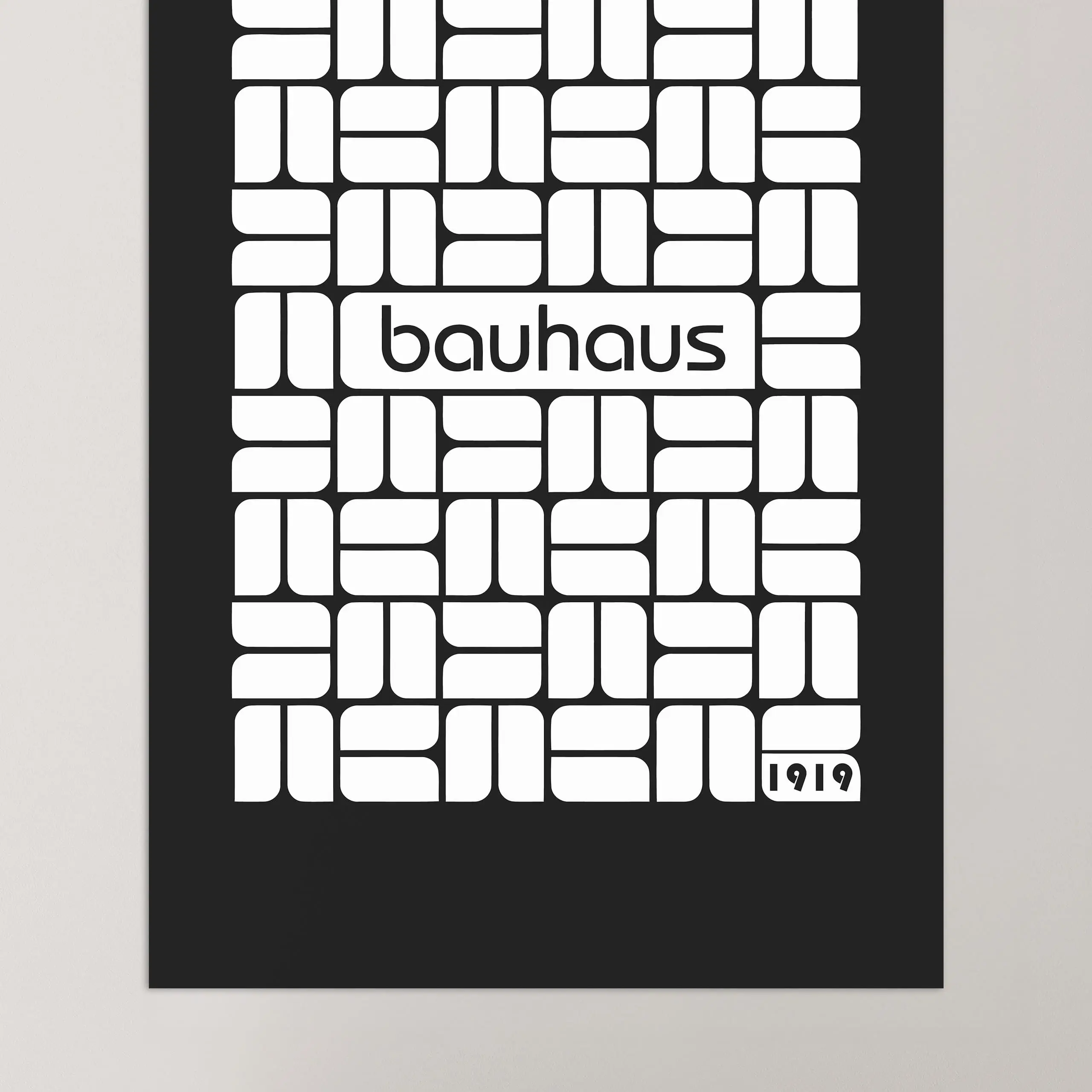 Cette affiche moderne Bauhaus est composée d'un motif en forme de rectangles arrondis orné de la typographie Bauhaus sur fond coloré noir.