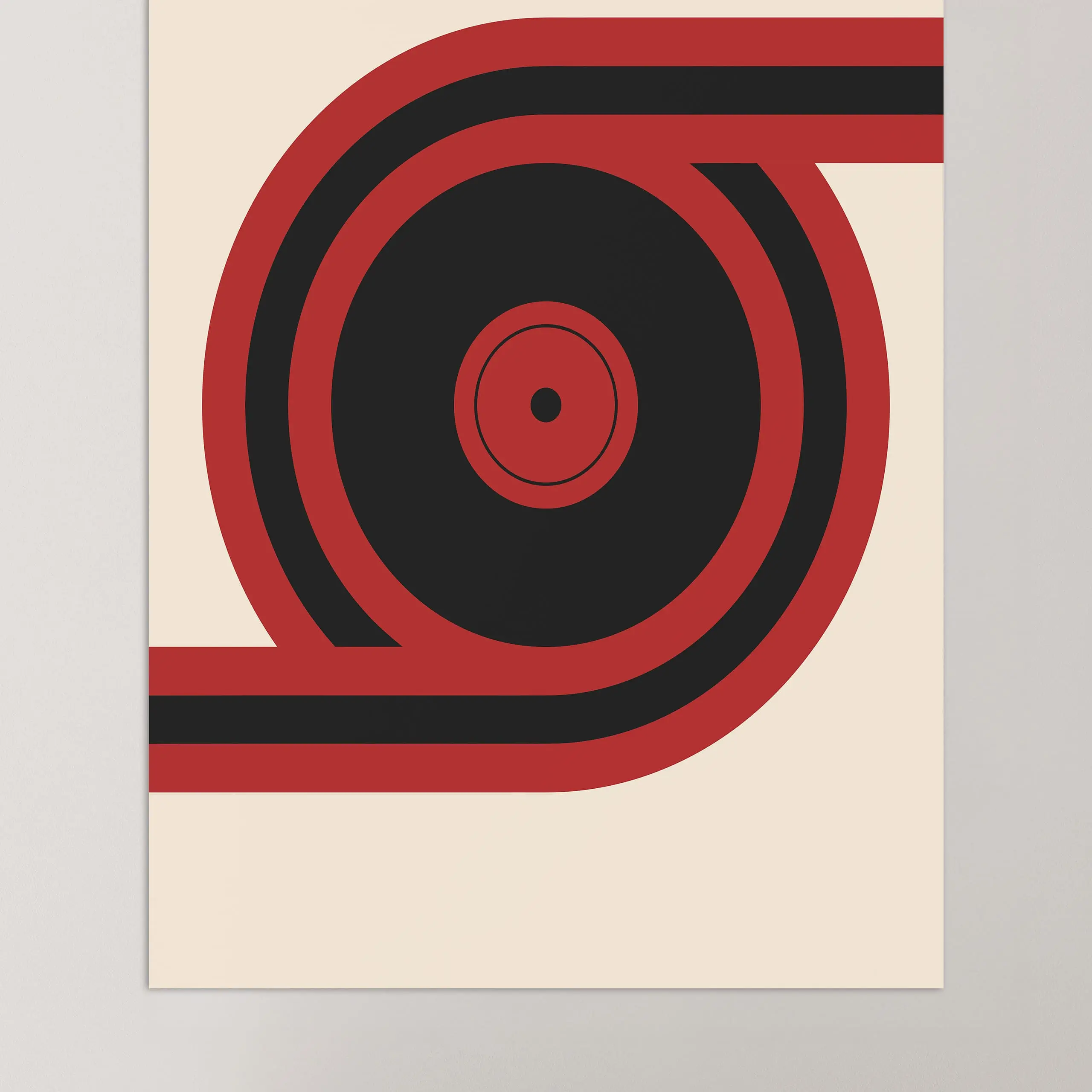 Cette affiche minimaliste vintage de couleur rouge Bauhaus est composée d'une forme circulaire abstraite et libre d'interprétation sur fond beige.
