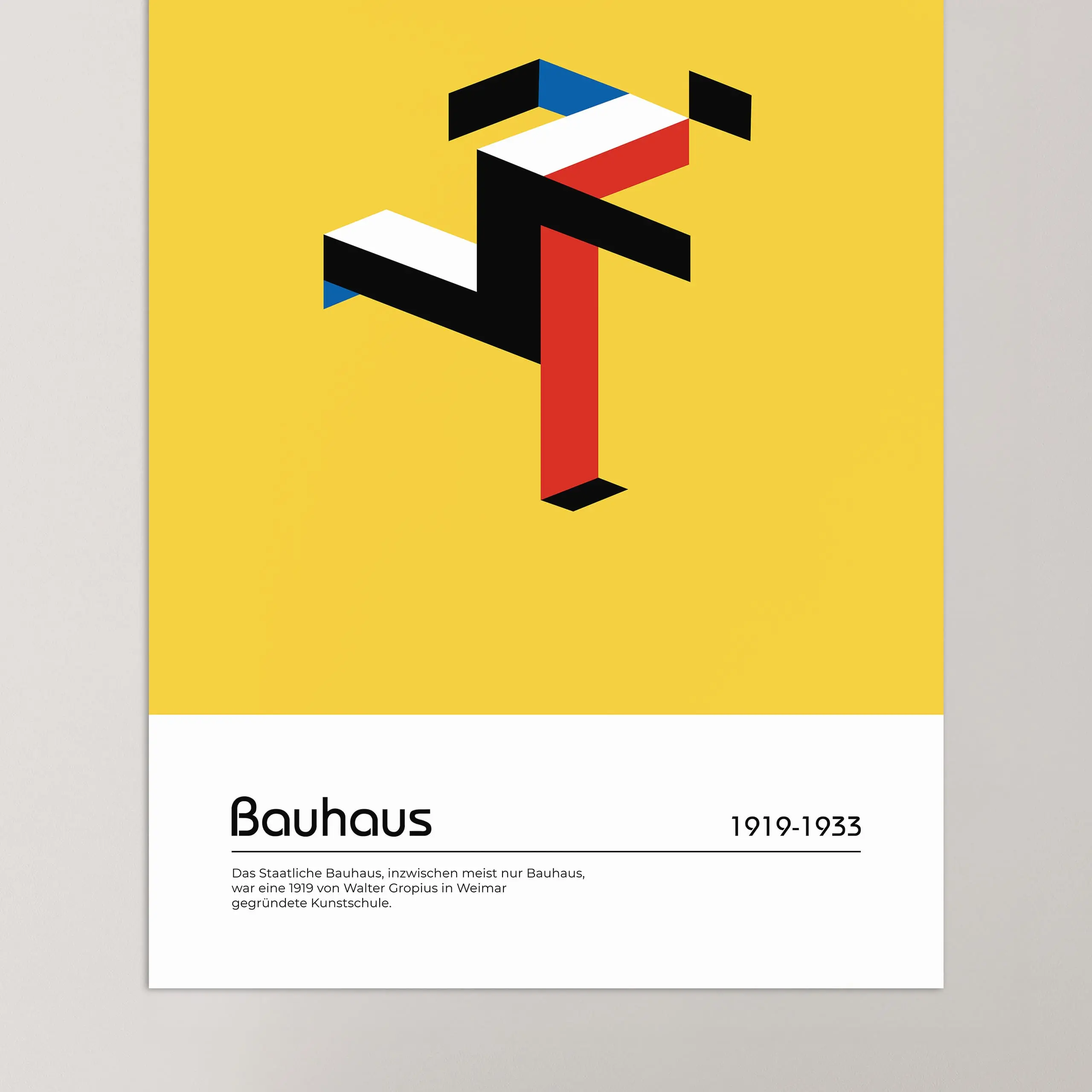 Cette affiche aux couleurs primaires originales Bauhaus rouge jaune et bleu représente homme qui court composé de parallélogrammes au centre d'un rectangle jaune sur fond blanc.