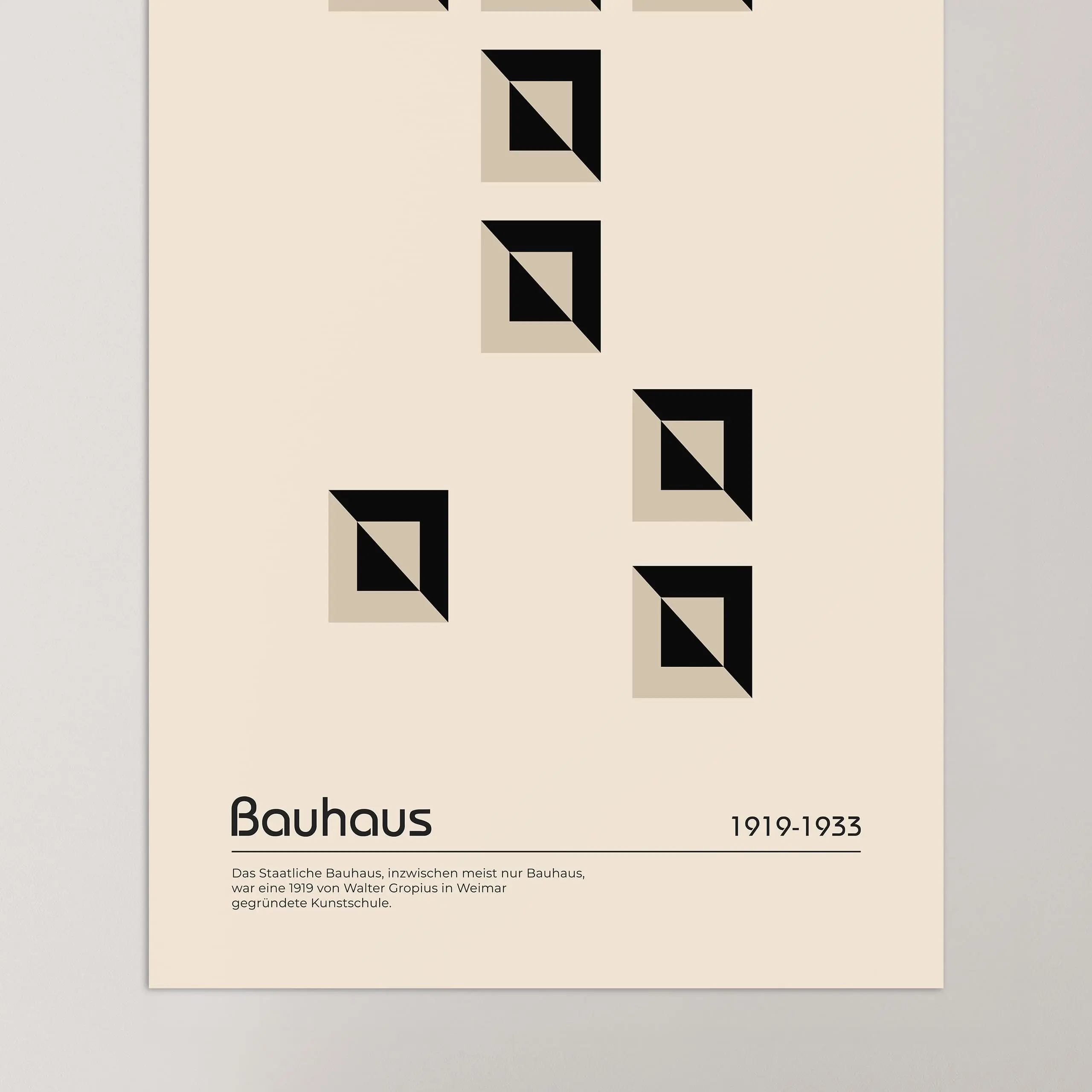 Cette affiche de couleur beige Bauhaus représente des carrés mis en relief par un jeu de contraste et répartis aléatoirement sur fond beige.
