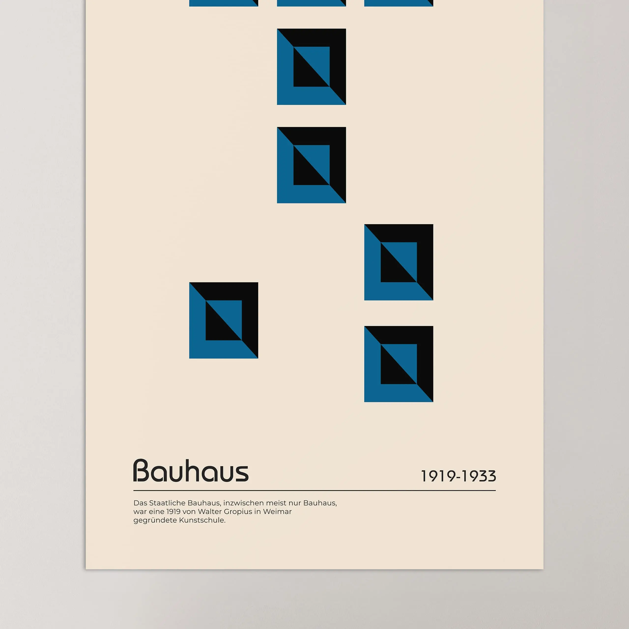 Cette affiche de couleur bleue Bauhaus représente des carrés mis en relief par un jeu de contraste et répartis aléatoirement sur fond beige.