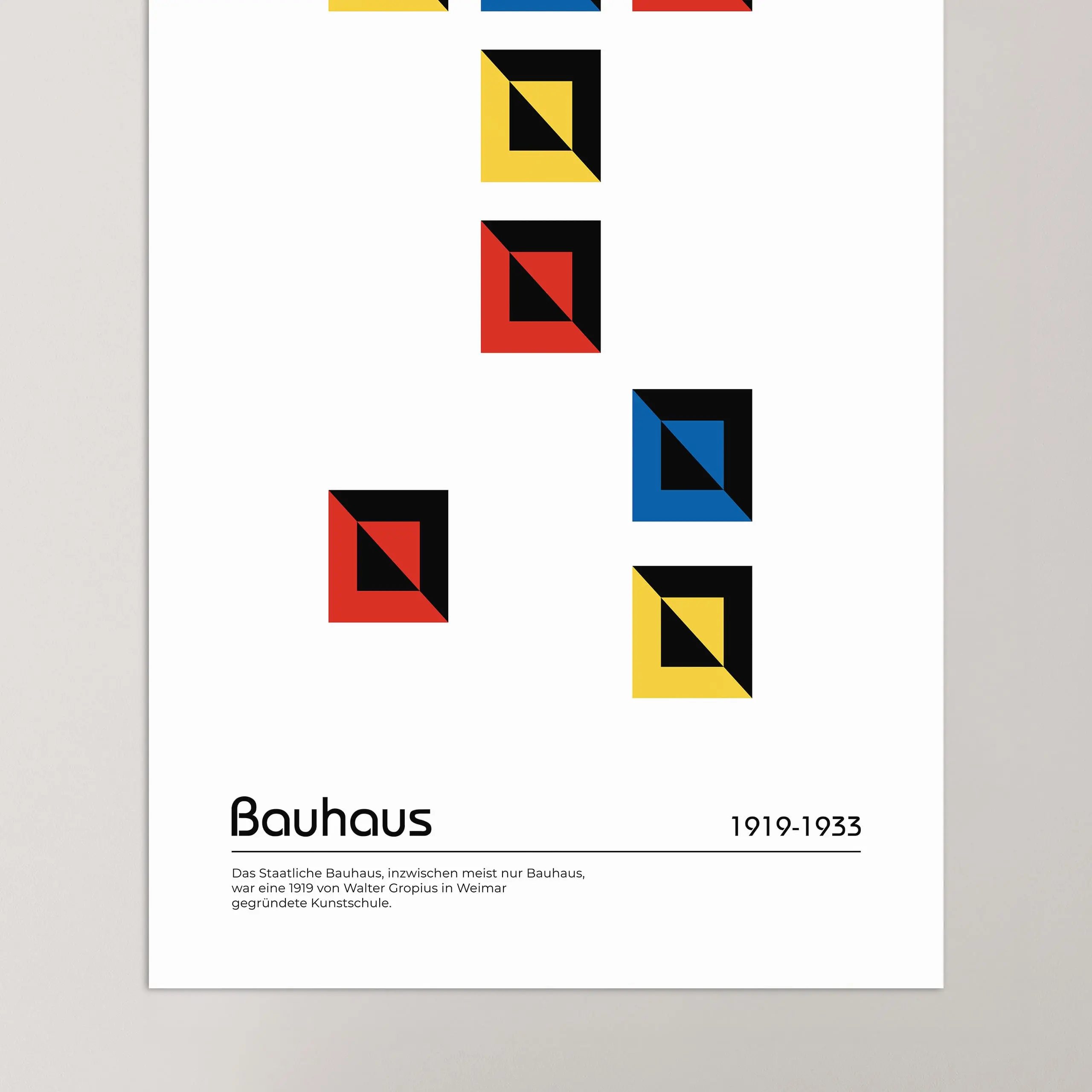 Cette affiche aux couleurs primaires originales Bauhaus rouge jaune et bleu représente des carrés mis en relief par un jeu de contraste et répartis aléatoirement sur fond blanc.