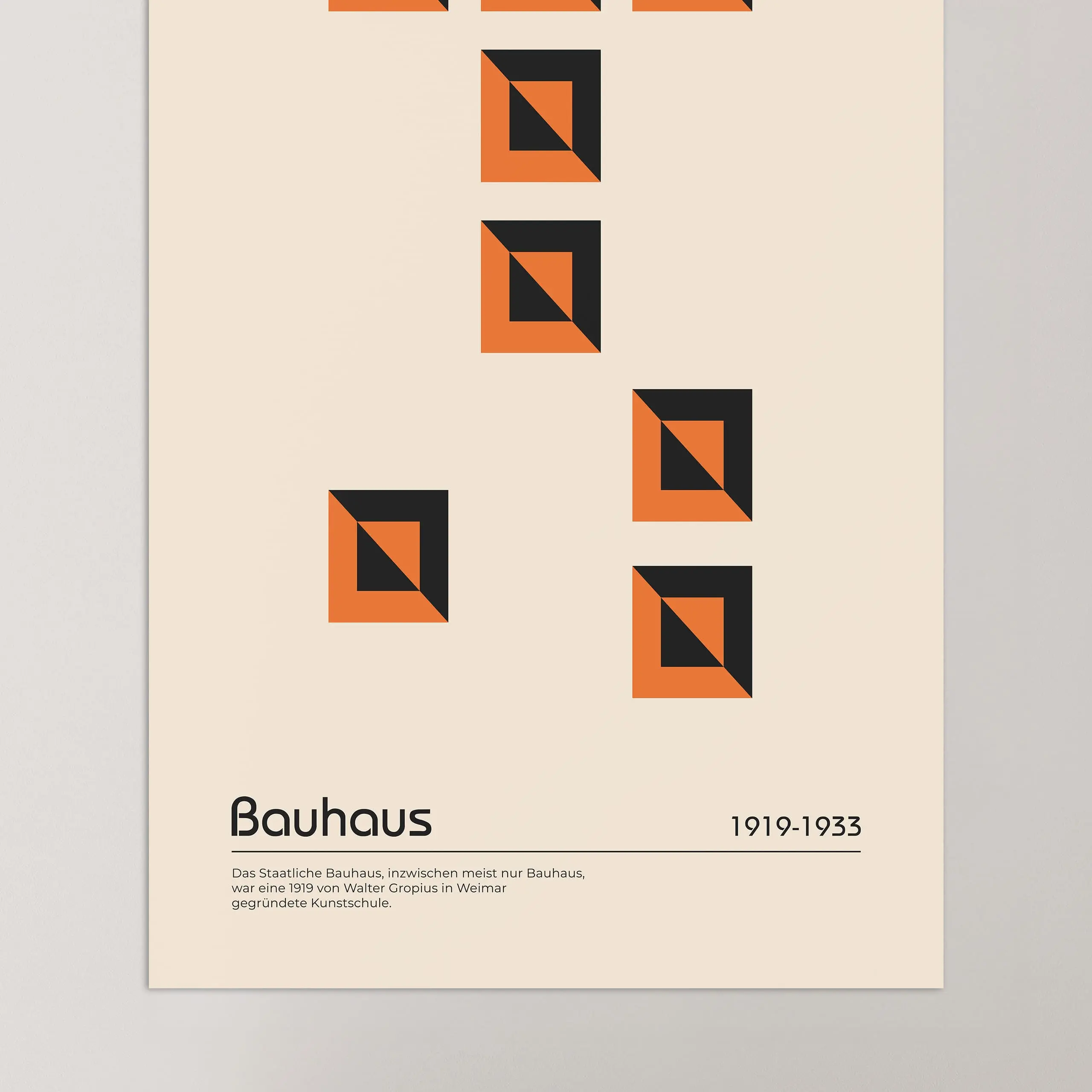 Cette affiche de couleur orange Bauhaus représente des carrés mis en relief par un jeu de contraste et répartis aléatoirement sur fond beige.