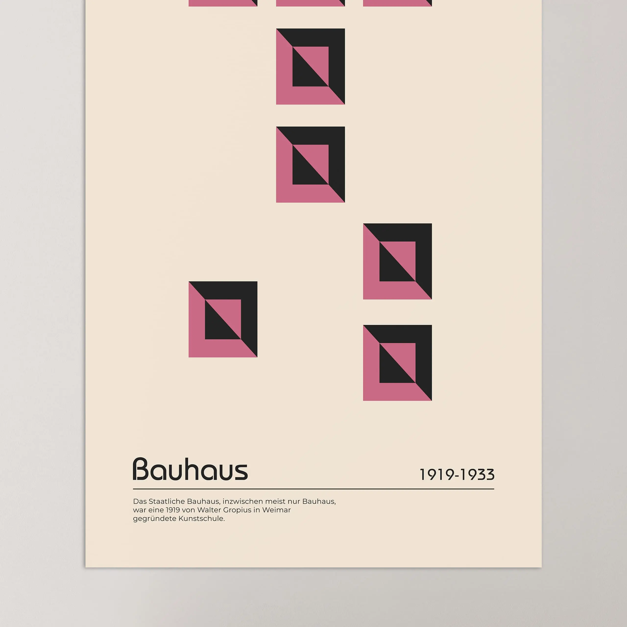 Cette affiche de couleur rose Bauhaus représente des carrés mis en relief par un jeu de contraste et répartis aléatoirement sur fond beige.