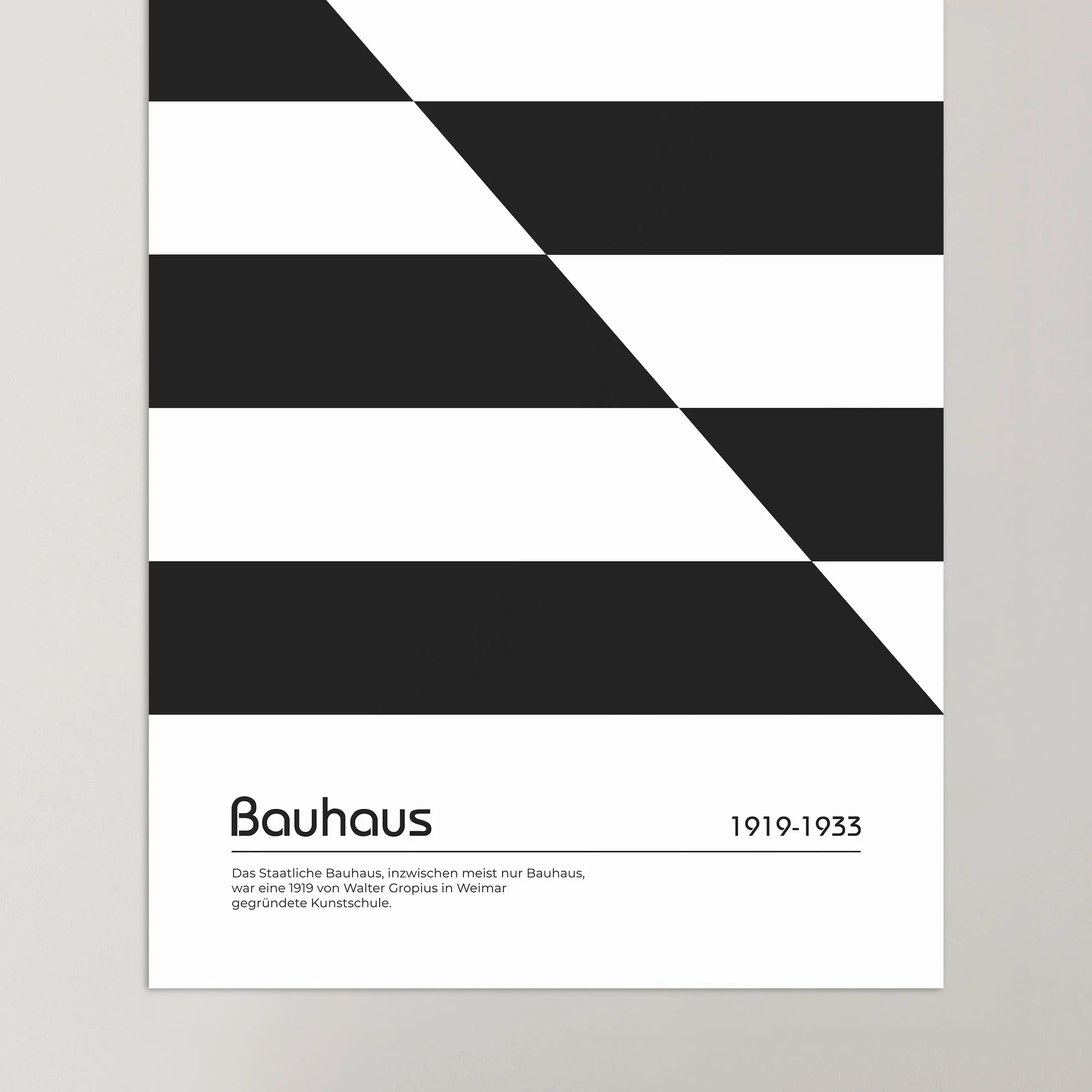 Cette affiche de couleur noire Bauhaus est composée de bandes horizontales, placées à intervalles de largeur équivalentes, qui se croisent et s'inversent sur une diagonale créant un jeu de positif négatif sur fond blanc.
