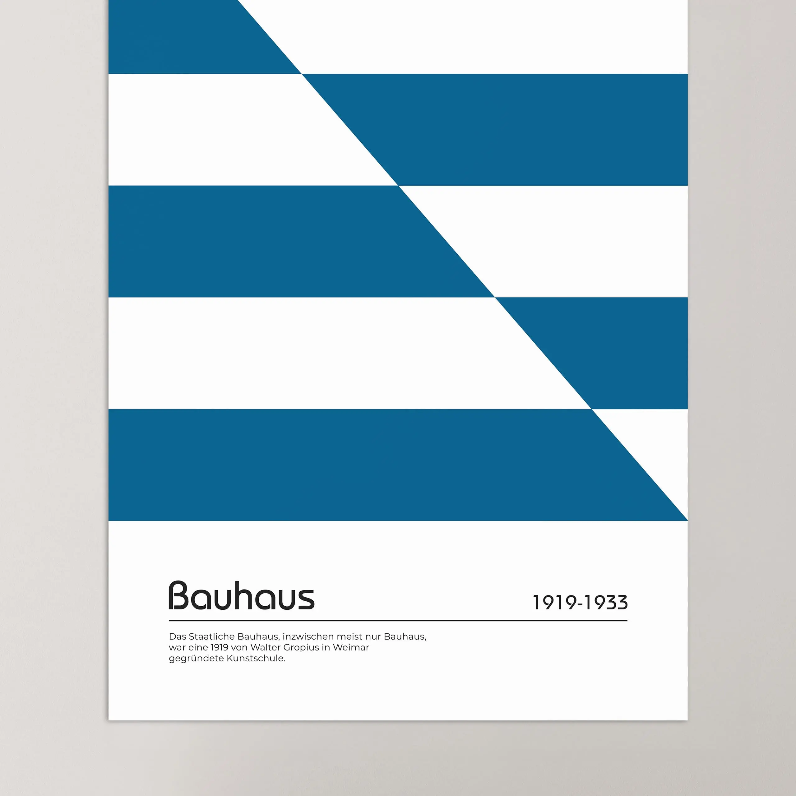 Cette affiche de couleur bleue Bauhaus représente des bandes horizontales, placées à intervalles de largeur équivalentes, qui se croisent et s'inversent sur une diagonale créant un jeu de positif négatif sur fond blanc.