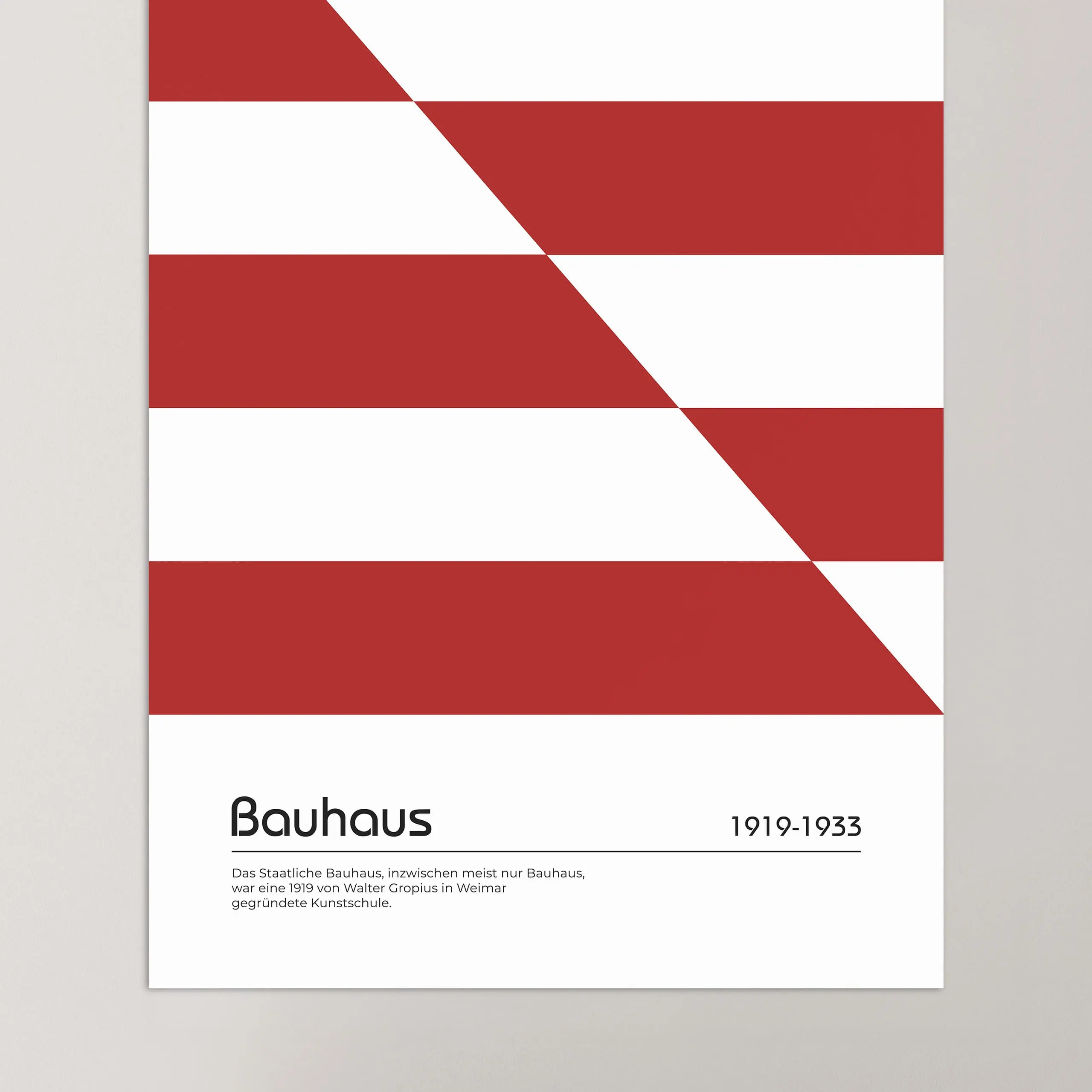 Cette affiche de couleur rouge Bauhaus est composée de bandes horizontales, placées à intervalles de largeur équivalentes, qui se croisent et s'inversent sur une diagonale créant un jeu de positif négatif sur fond blanc.
