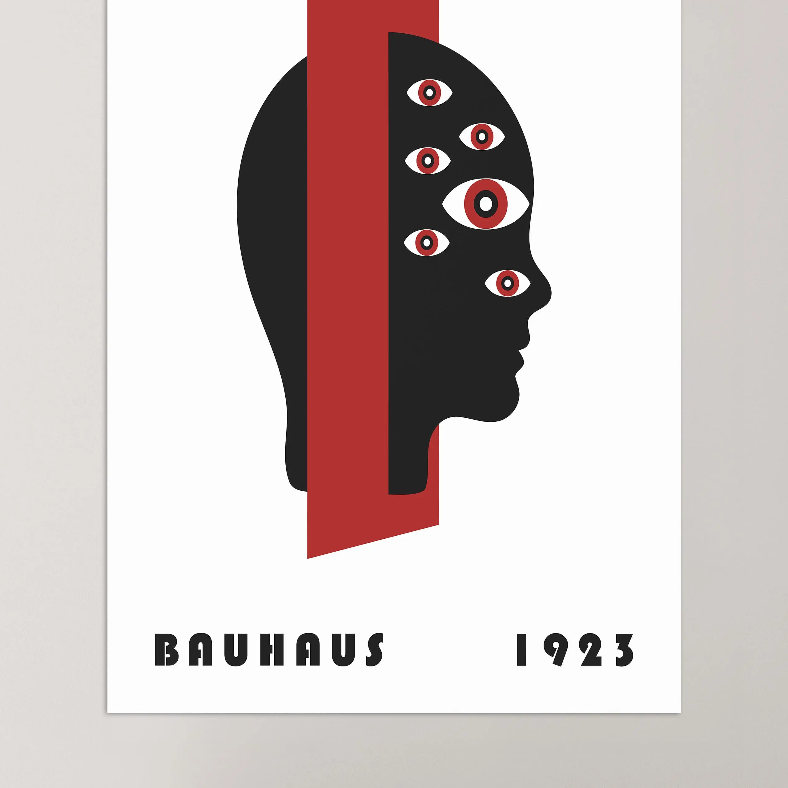 Cette affiche graphique Bauhaus rouge et noire représente un visage figuratif vu de profil, séparé en deux parties et agrémenté par des yeux sur fond blanc.
