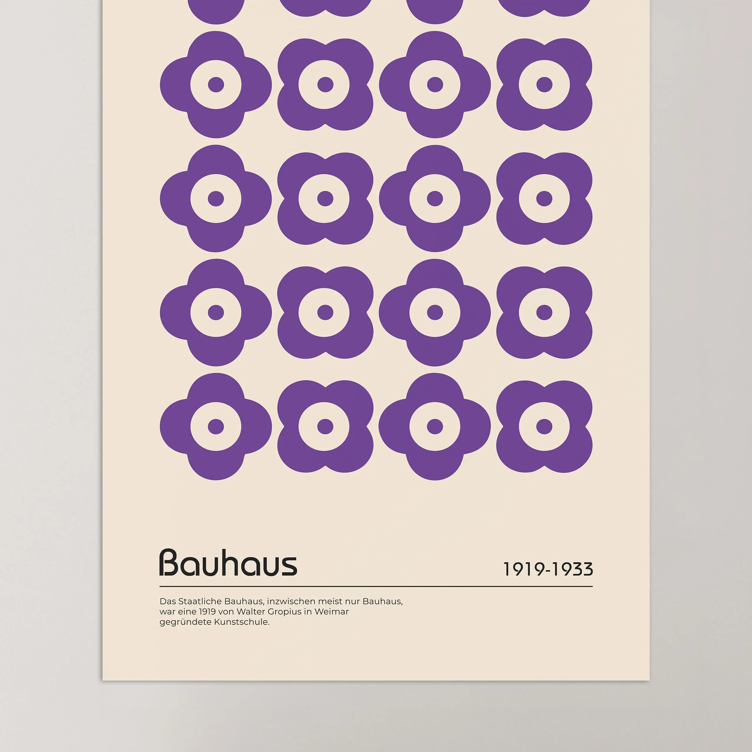 Cette affiche de couleur violette Bauhaus représente un motif floral répétitif sur fond beige.