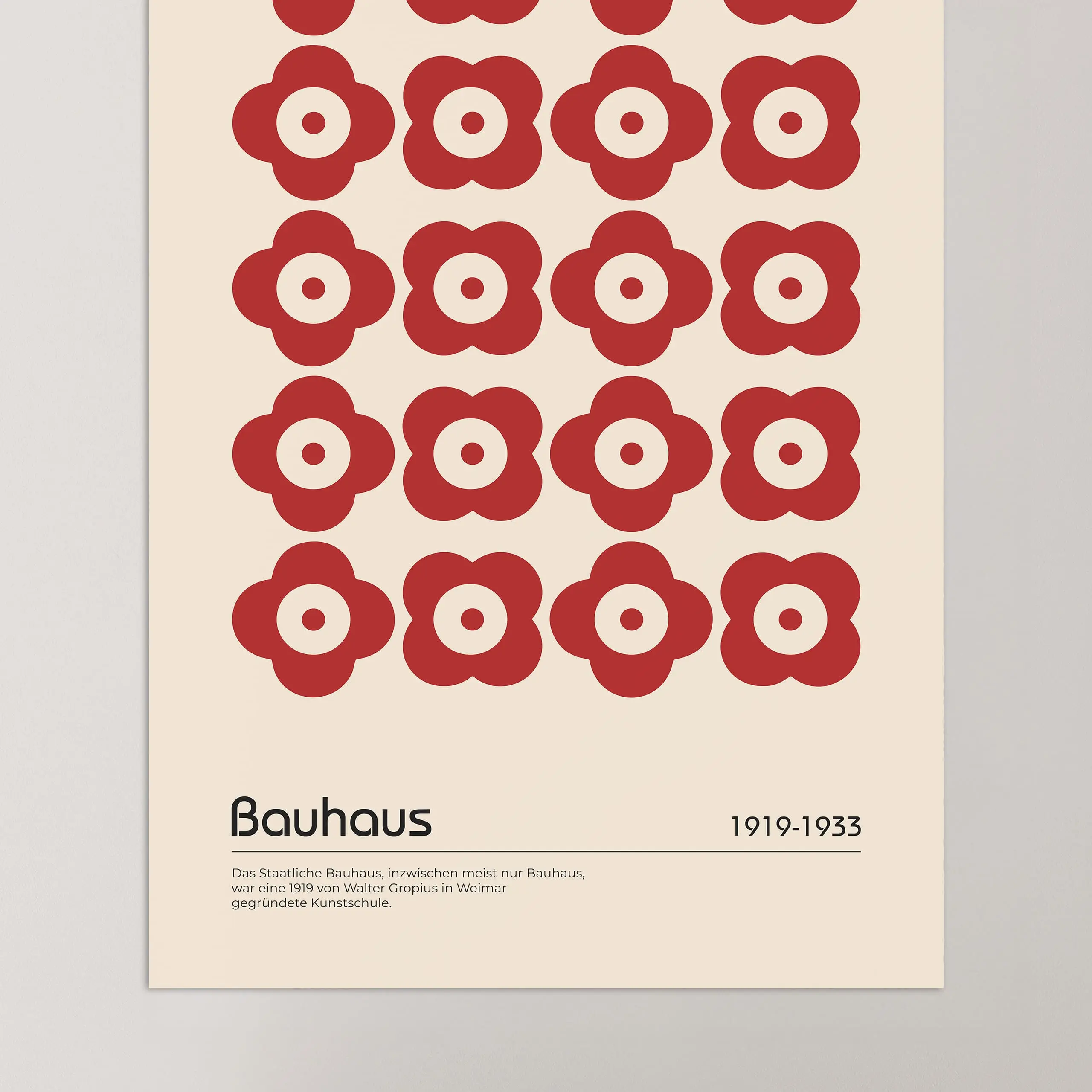 Cette affiche de couleur rouge Bauhaus représente un motif floral répétitif sur fond beige.