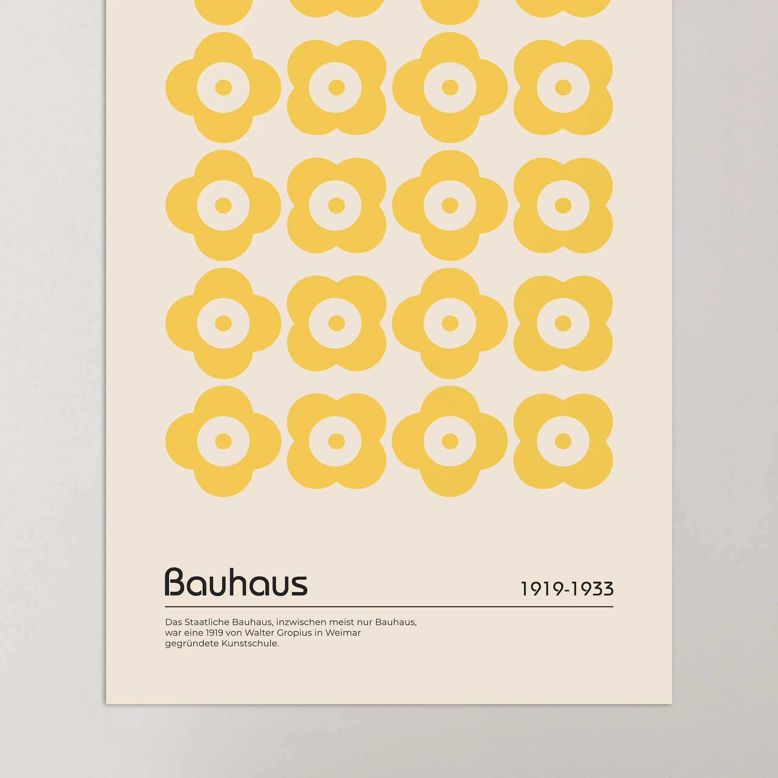 Cette affiche de couleur jaune Bauhaus représente un motif floral répétitif sur fond beige.